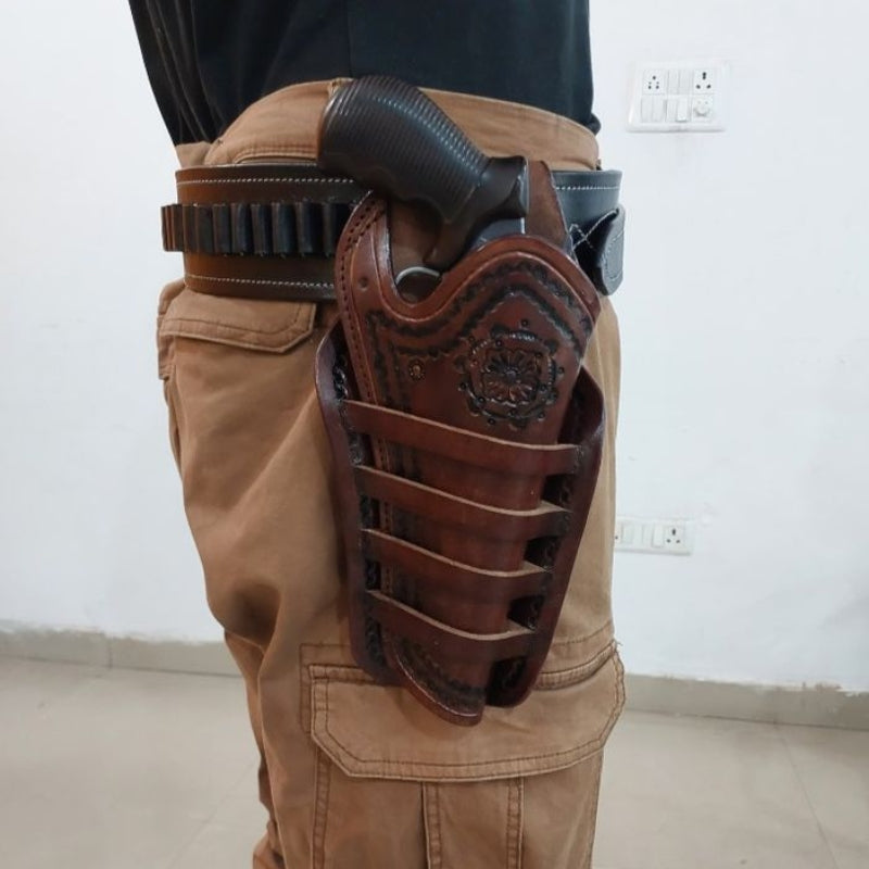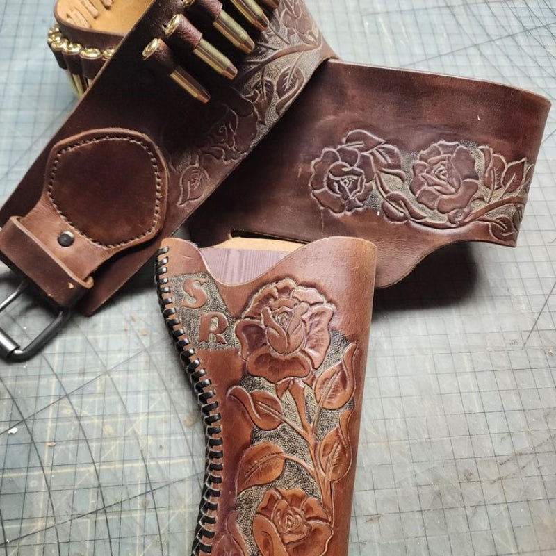 Experience the perfect blend of tradition and toughness with our hand-tooled leather gun holsters. Made for those who value style, strength, and heritage.
